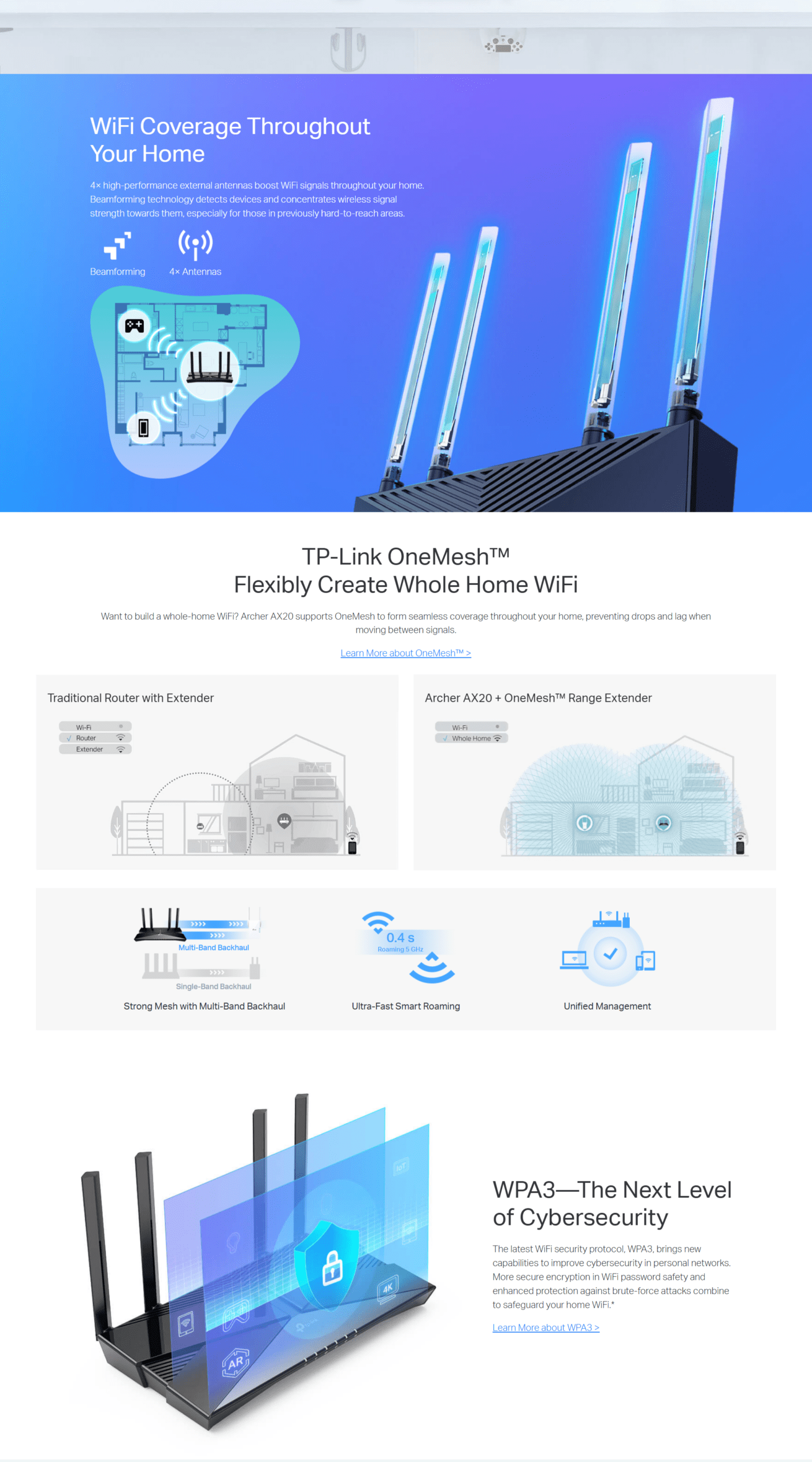 | OneMesh™ | OneMesh™ Supported Without replacing your existing devices or buying a whole new WiFi ecosystem, OneMesh™ helps you create a more flexible network that covers your entire home with TP-Link OneMesh™ products. Learn More> All OneMesh Products> |