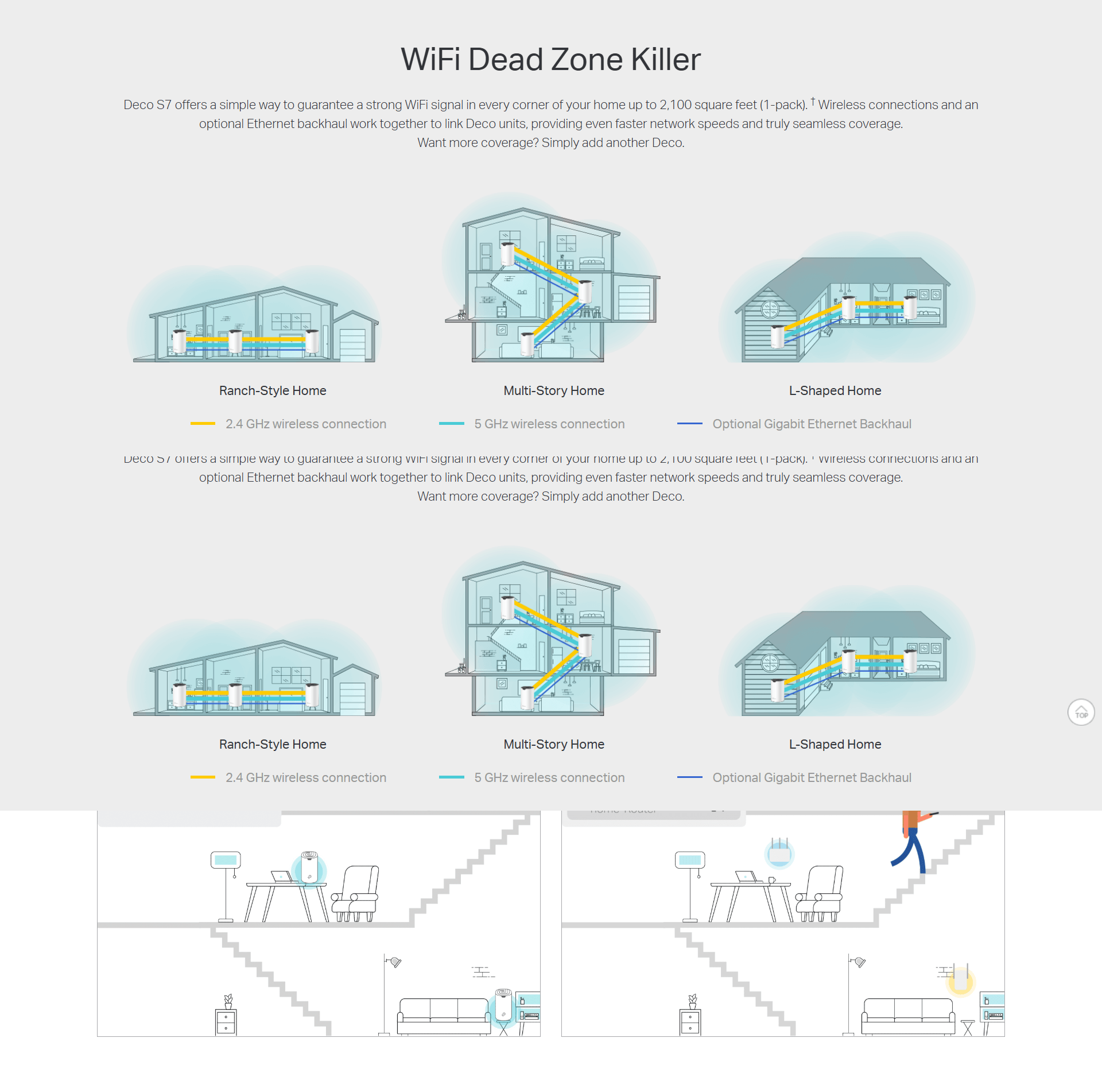 | Package Content | Deco S7 (3-pack) 3 Deco S7 Units 1 RJ45 Ethernet Cable 3 Power Adapters Quick Installation GuideDeco S7 (2-pack) 2 Deco S7 Units 1 RJ45 Ethernet Cable 2 Power Adapters Quick Installation GuideDeco S7 (1-pack) 1 Deco S7 Unit 1 RJ45 Ethernet Cable 1 Power Adapter Quick Installation Guide |